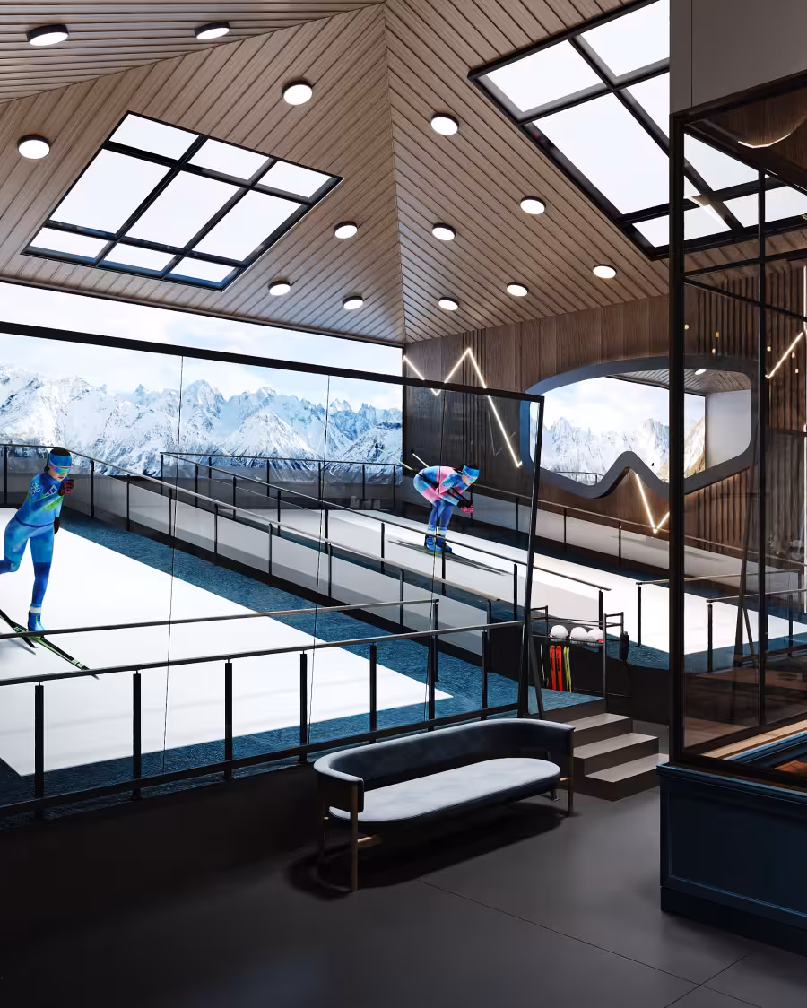A calm space overlooking the track. Rest, observe, and recharge between sessions in a warm, architectural setting.
